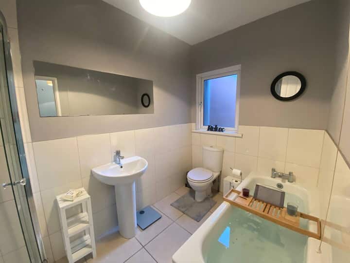 Our bathroom consists of both a shower and bathtub which are separate, so there is a choice for those who may want a to have a hot bubbly bath or a hot steaming shower.